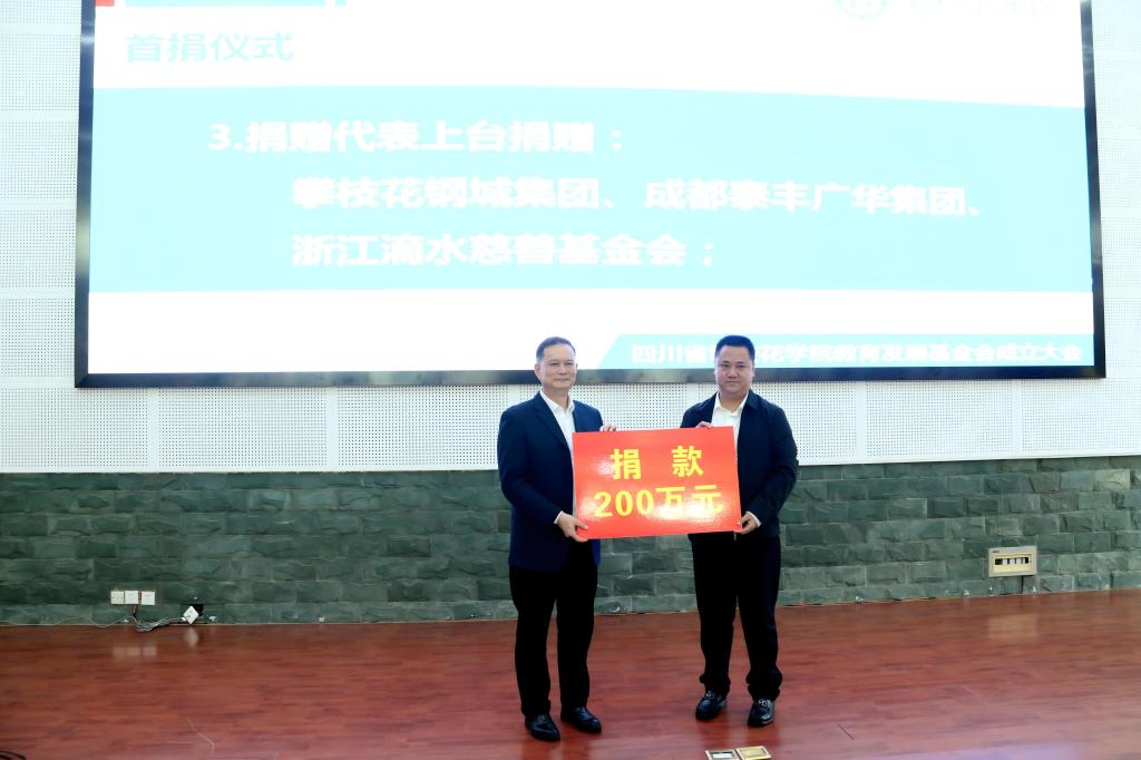 首捐环节,攀枝花钢城集团、成都泰丰广华集团各注入200万元原始基金,浙江滴水慈善基金会及校友王虎、罗欣夫妇等再联合捐赠逾40万元,现场累计到账突破440万元